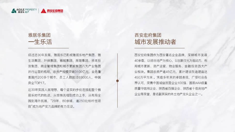 雅居乐集团,成立于1992年,是一家以地产为主,多元业务协同发展的综合性企业集团。一直以来,雅居乐秉持“一生乐活”的品牌理念,始终关注人们对美好生活的追求,致力于成为领先的优质生活服务商。